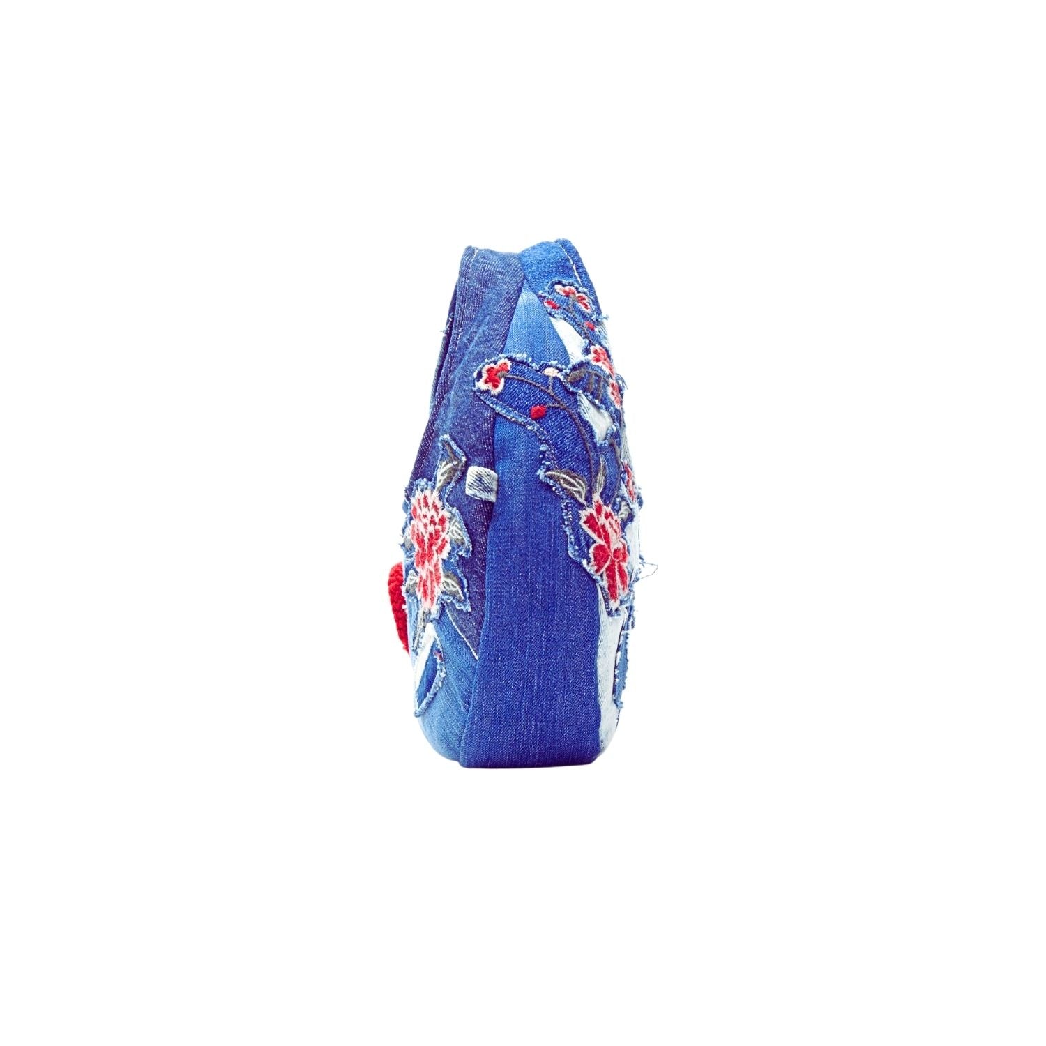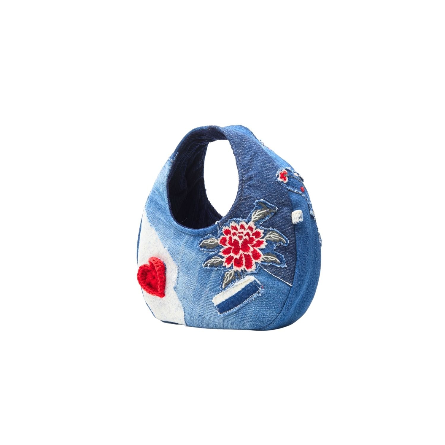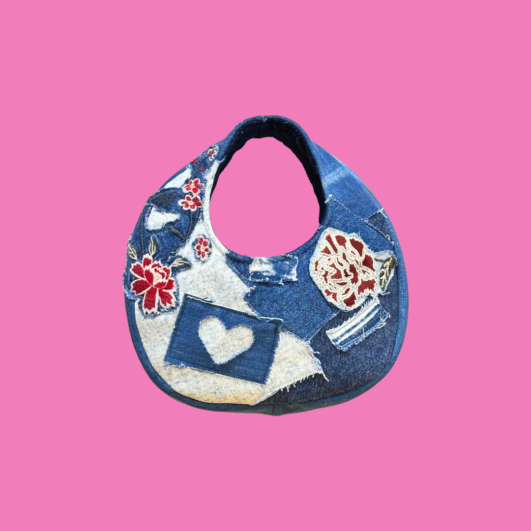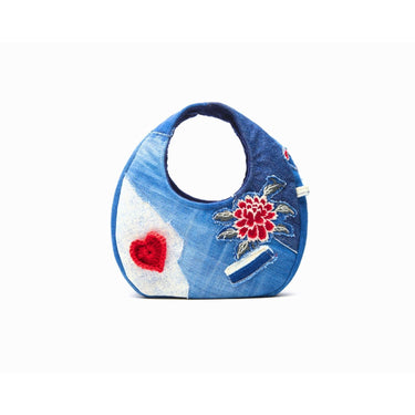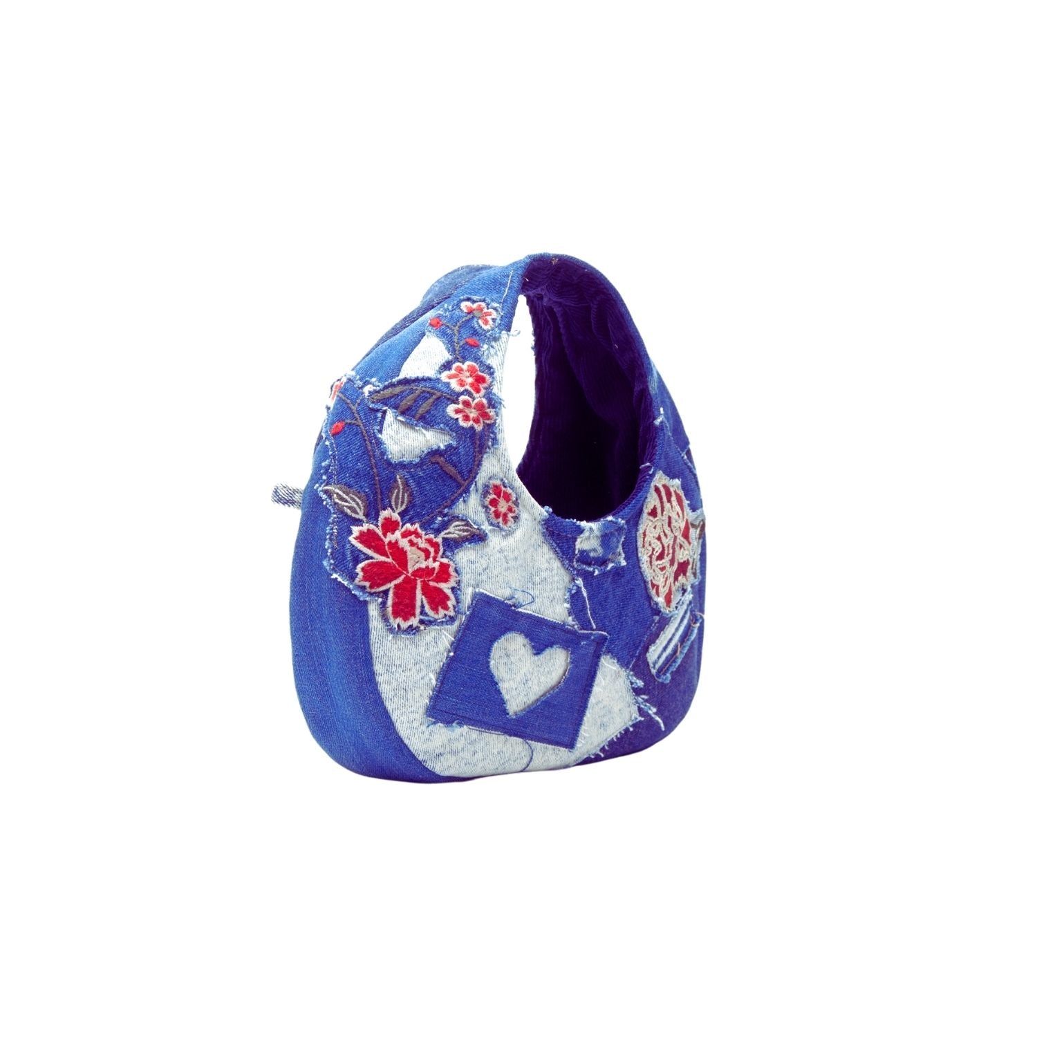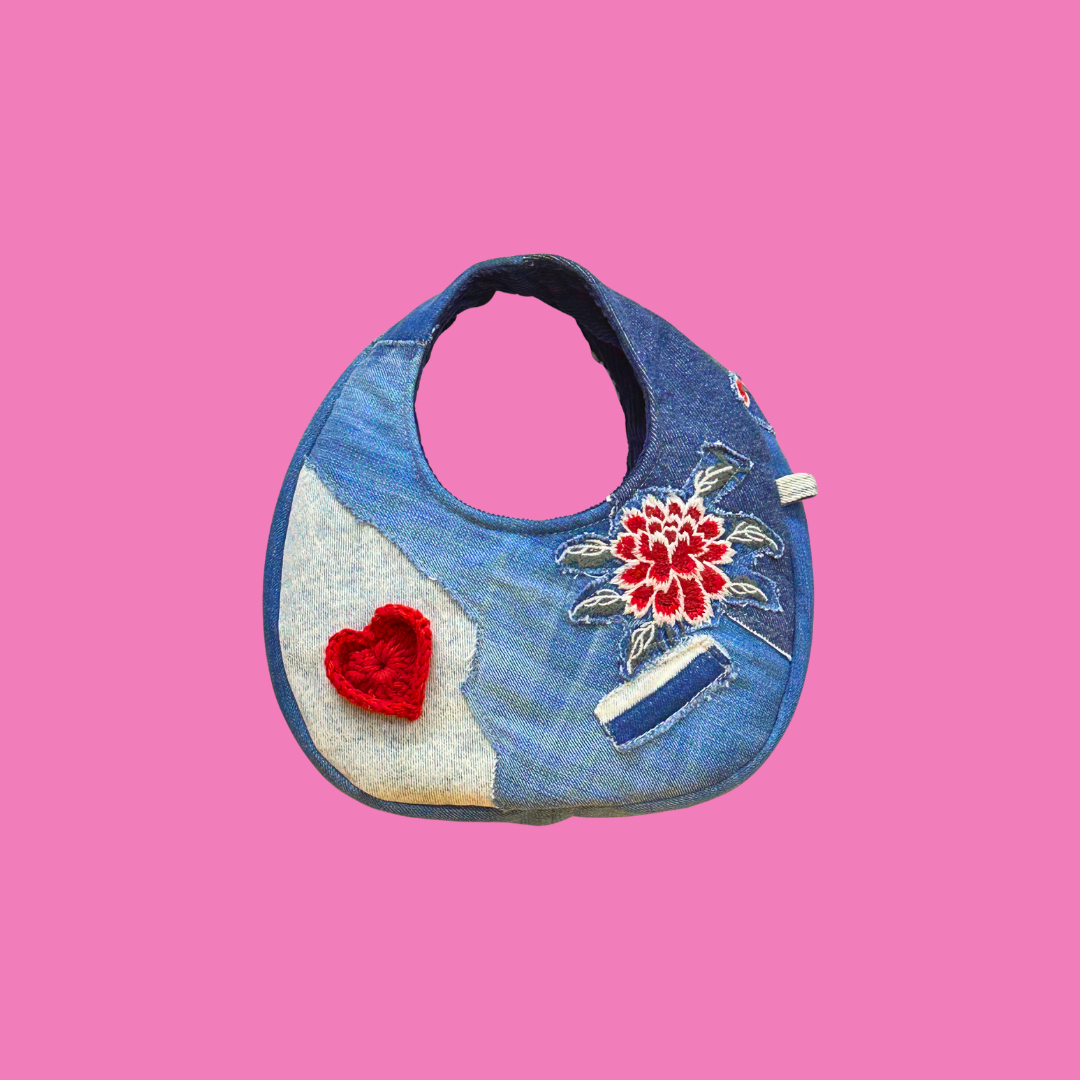 Outer Material and handle: Vintage cotton denim. Hand crochet heart is made from recycled cotton yarn