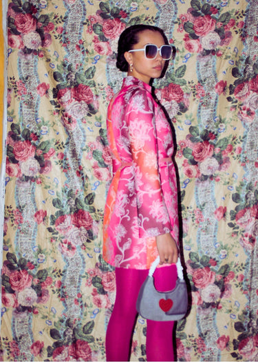 This 1960's Japanese inspired micro dress is made from vintage floral upholstery and a repurposed upholstery zipper.