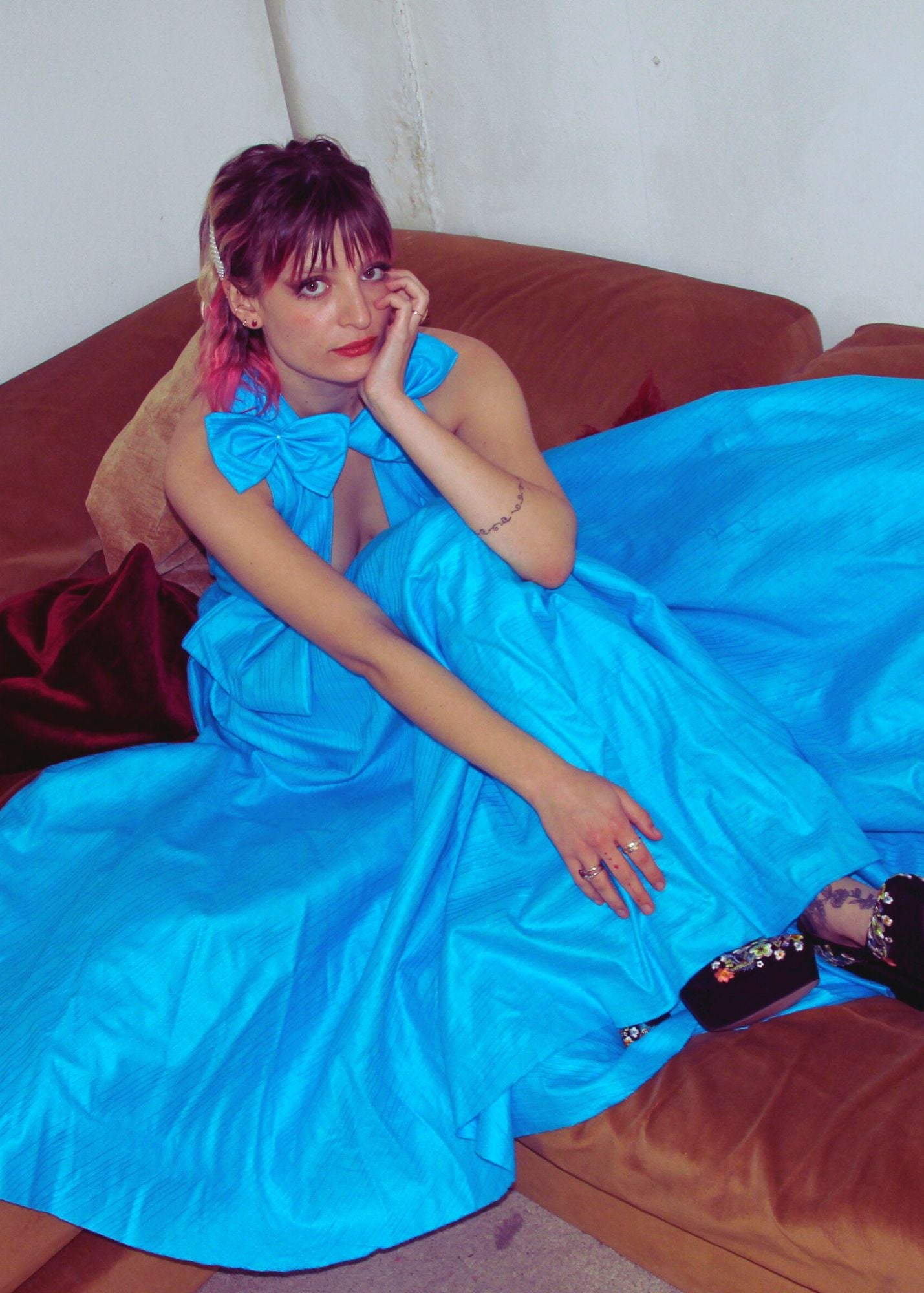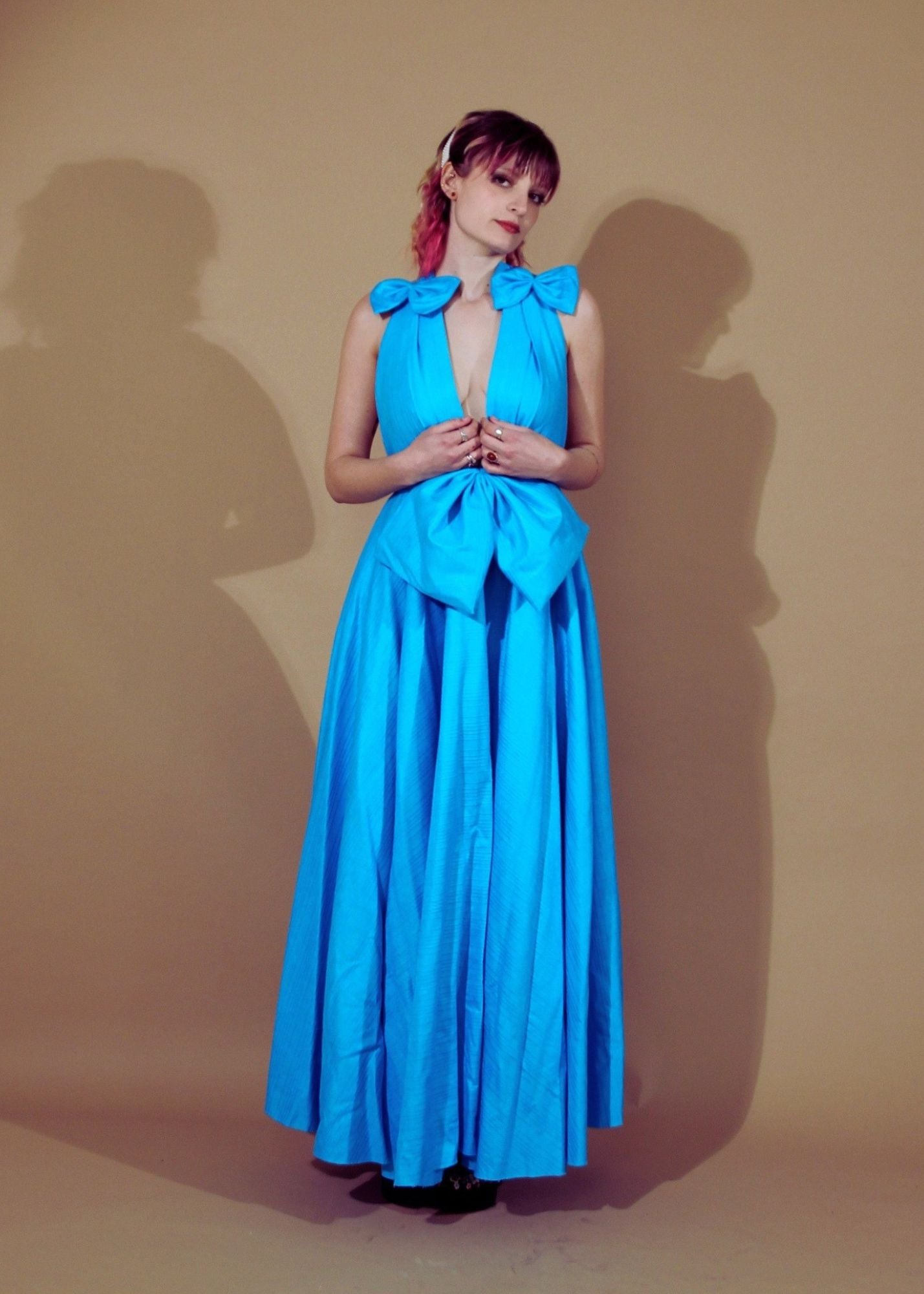Bow Plunge Neck Gown with cross over back straps.